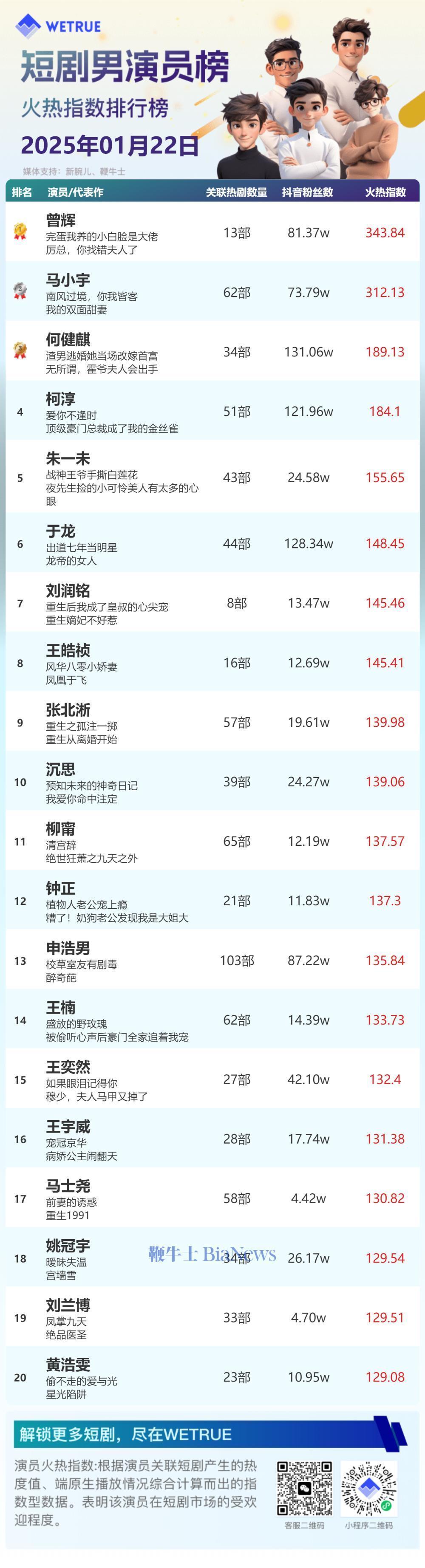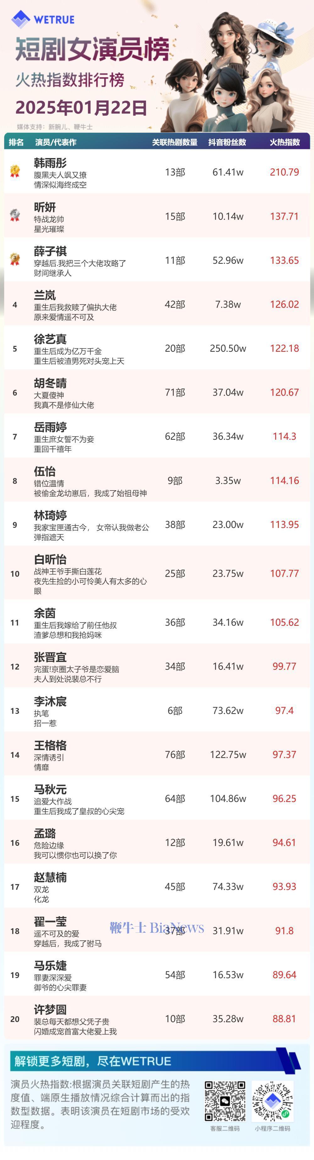 1月23日音信,为匡助短剧从业者提供更多信息,专注于短剧报谈的新腕儿和科技媒体鞭牛士谄谀WETRUE短剧热度榜共同推出多种短剧热度榜。