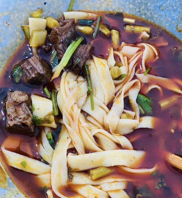 面条简略有筷子头那么粗,是以这个面进口有嚼劲,还有花生碎和花椒的香味,进口会认为微甜,临了会辣上那么一下,香味会在嘴里停留很久。