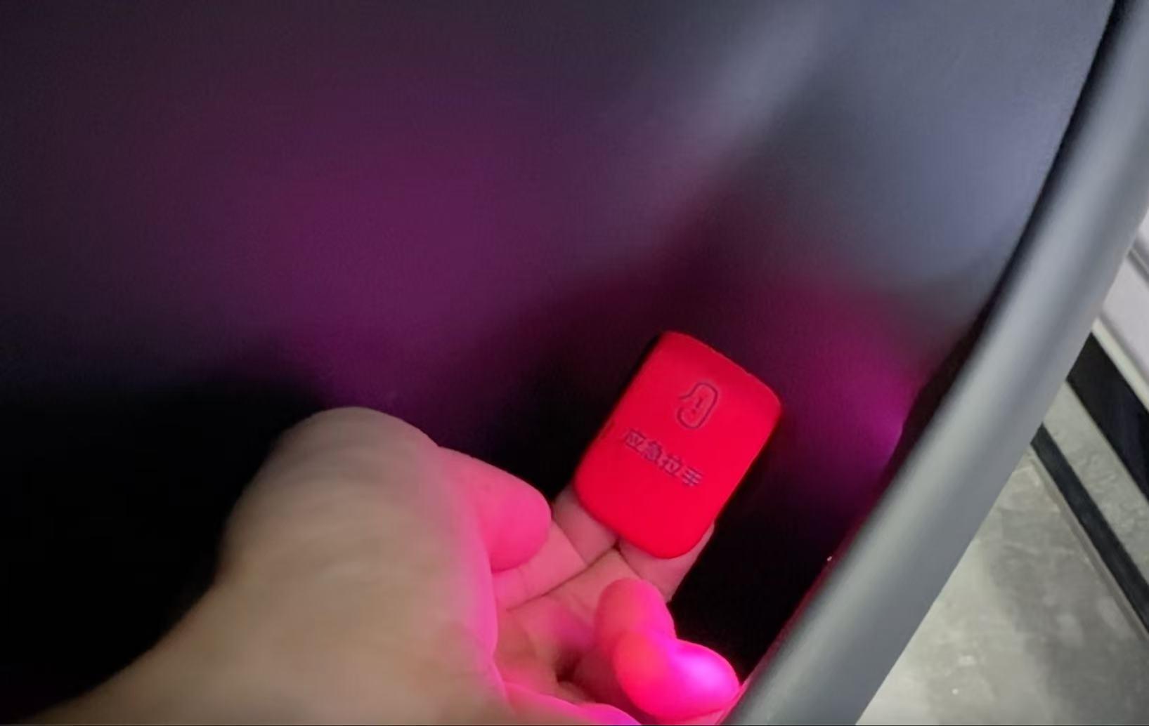 特斯拉ModelY的救急门把手藏在储物格,需要掀开上层盖板,掰开锁扣,再拉出拉绳才不错开门。