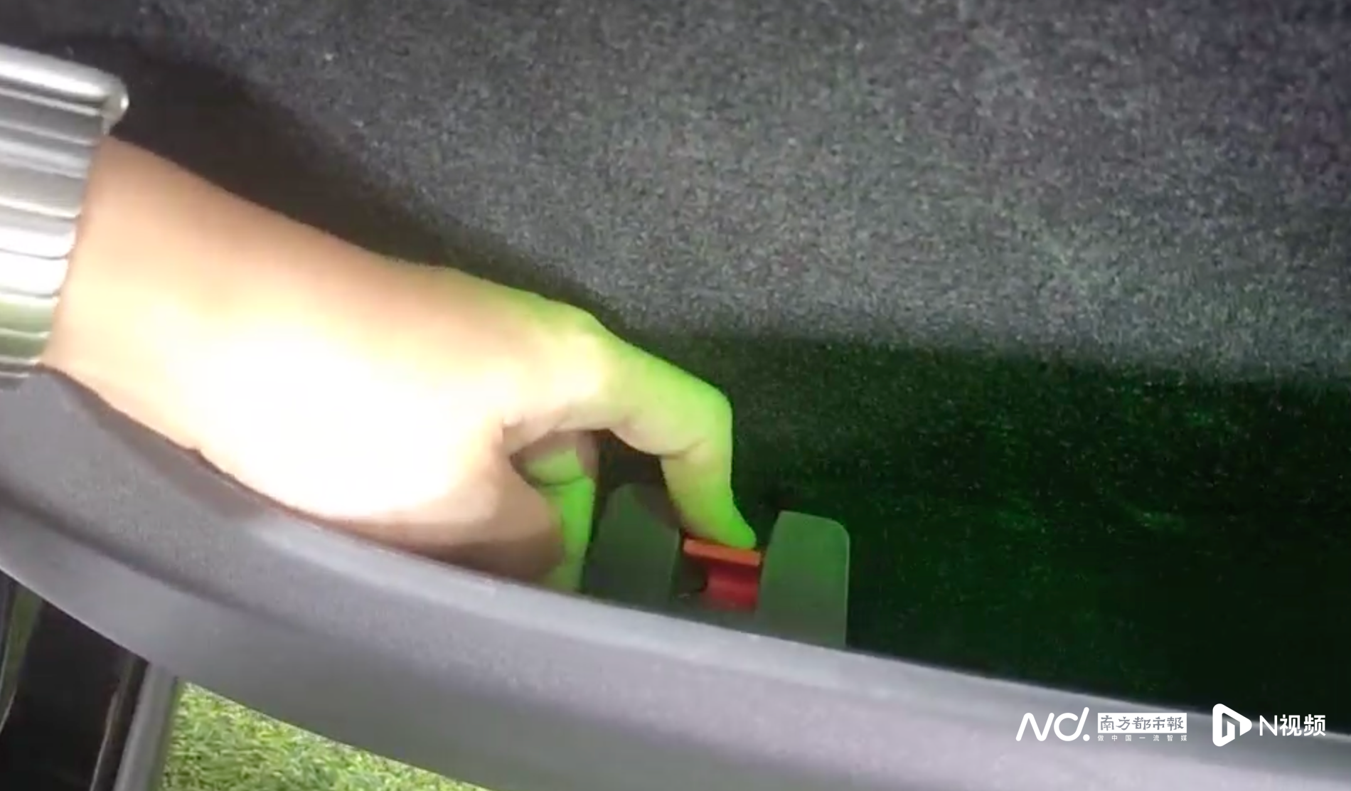 南都·湾财社记者现场体验特斯拉Model 3后驱版2022款发现,前排主驾与副驾门把部属方的扶手位置,均设有可用手指扳动的机械开关。但坐到后排,肉眼可见之处却未见救急机械把手。而特斯拉为后排乘客提供的“逃生通谈”居然藏在后备箱:你需要将后排座椅放倒,钻入后备箱,拨动里面救急门闩,大开尾门逃生,比较前排乘客多了“倒、爬、拨”三个设施。