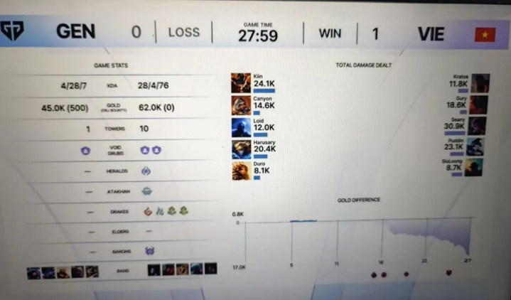 这场比赛最离谱的点便是越南队全程碾压GEN,上单奎桑提径直对位单杀Kiin的兰博,打野剑魔更是野区怒斩GEN野辅,然后GEN的团战亦然一碰就碎,全程被对方暴打,让不雅看比赛的不雅众直呼:给我干哪来了,这如故LCK打外卡吗?
