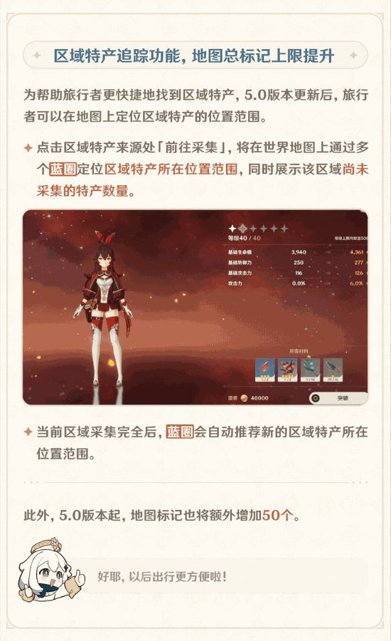 从5.0版块起,寰宇品级9将绽开!诞生组还为民众带了区域特产跟踪、任务长经由请示等新功能,同期尘歌壶、食品系统也有部分优化迭代。