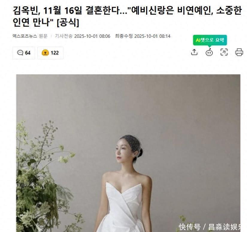韩国闻明女星,演员金玉彬要授室的音问,须臾在韩国文娱圈投下一颗甜密炸弹。据韩国媒体10月1日报说念,经纪公司Ghost Studio在1日肃肃布告,这位38岁的实力派女星将于11月16日与圈外只身夫举行婚典,情理是“碰见了稀奇的分缘”。