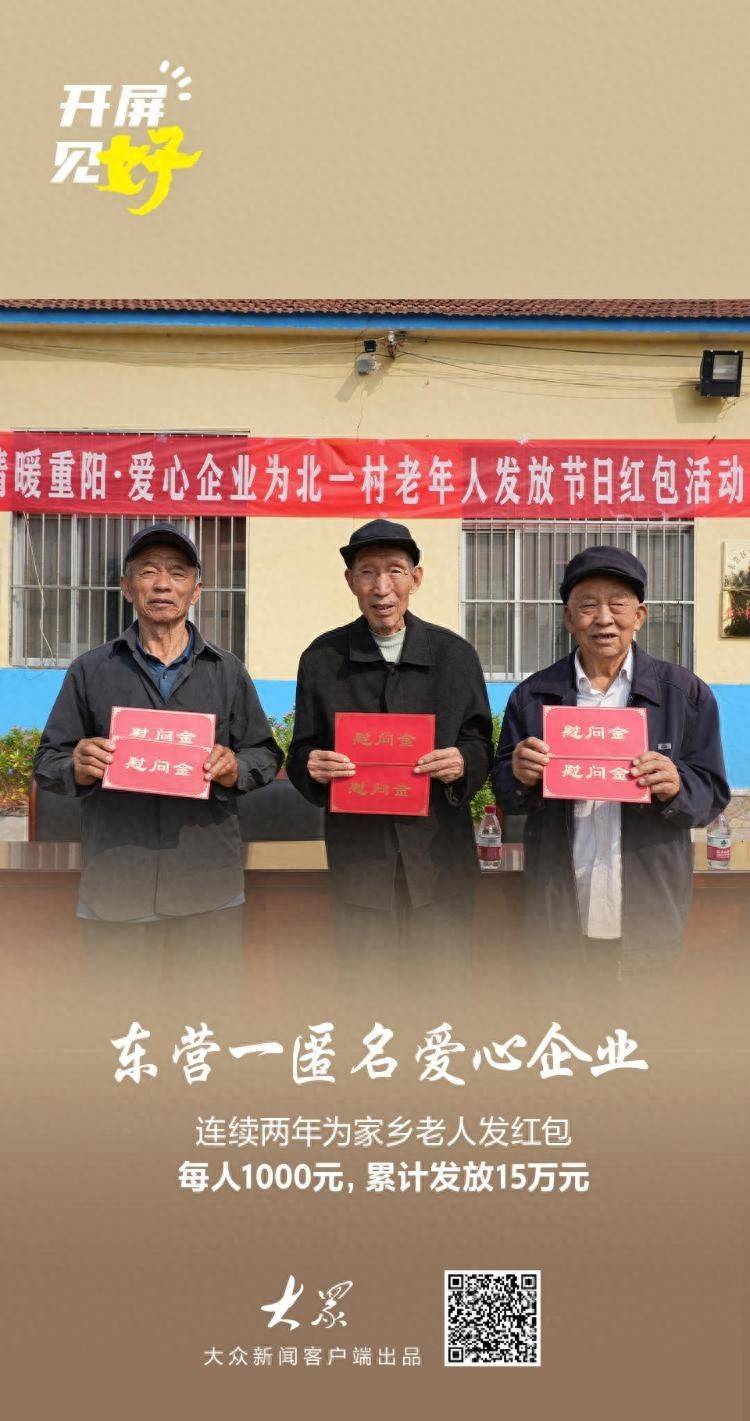 事情还要从本年10月的一通电话提及:东营市慈善总会再次接到一个匿名捐钱电话,对方在电话中暗意企业捐钱8万元指定用于向东营区北一村70周岁以上老年东说念主披发“孝心红包”。这已是这家爱心企业第二年以“骇人听闻”的样貌,为家乡老东说念主奉上情切与祝愿。两年来,该企业累计捐赠金额达15万元。