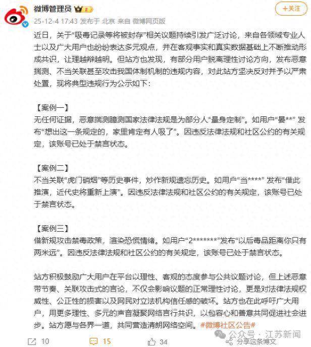 失当关联“虎门销烟”等历史事件,炒作新规渐忘历史。如用户“当****” 发布“借此推演,近代史将再行演出”。因违抗法律国法和社区条约的干系次第,该账号已处于禁言气象。